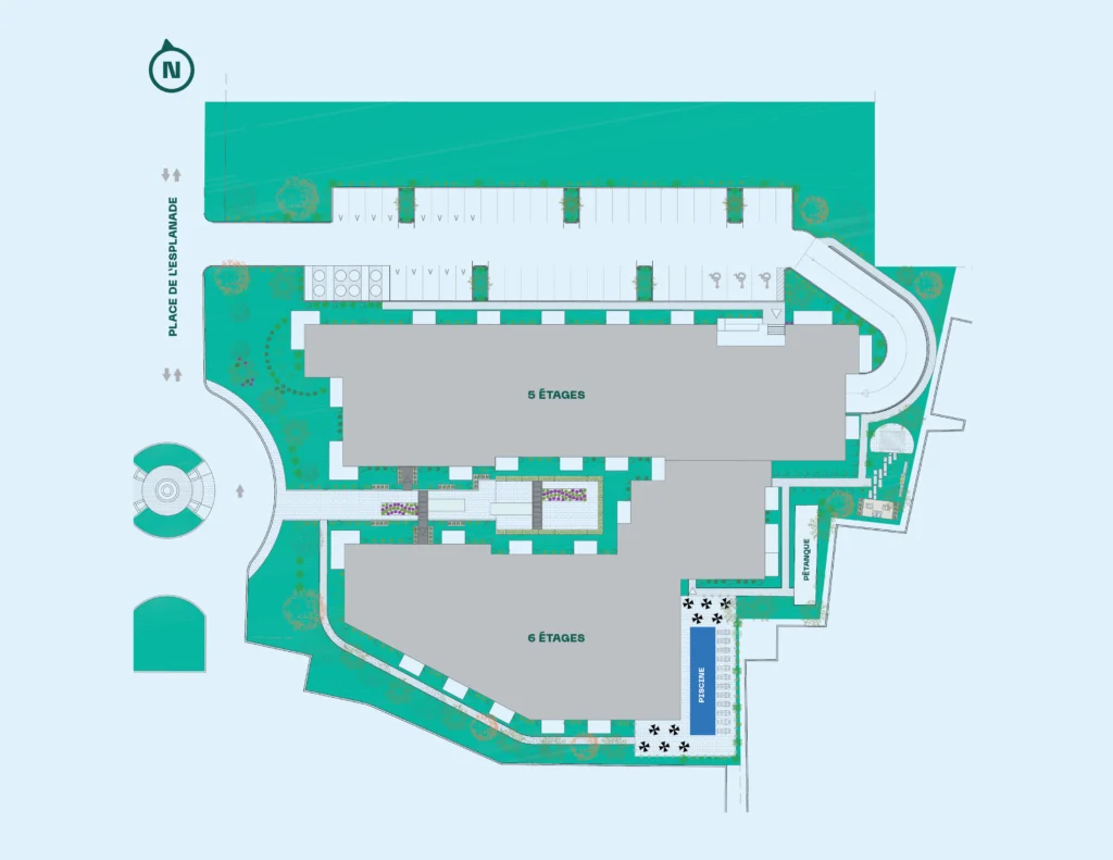 Espaces extérieurs aménagés, sentiers piétonniers,